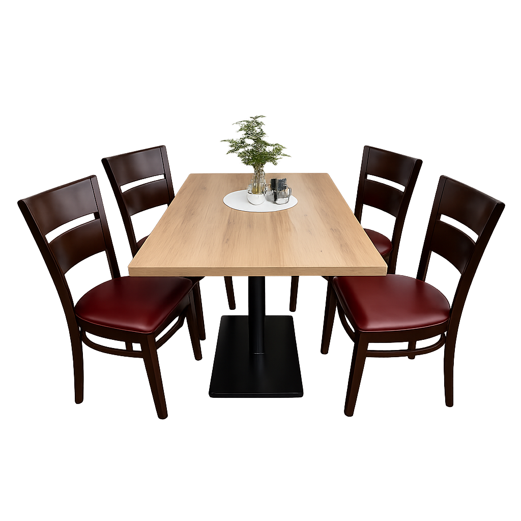 Diese professionelle Restaurant-Sitzgruppe (auch Restaurantgarnitur oder Sitzgruppe genannt) ist die perfekte Lösung für Gastronomie, Restaurant, Bistro, Café, Bar oder Hotel. Die Kombination aus stabilem Tisch mit Gußeisentischbein und vier komfortablen Massivholzstühlen vereint Langlebigkeit, Funktionalität und ein zeitloses Design – ideal für den täglichen, intensiven Einsatz im gewerblichen Bereich.