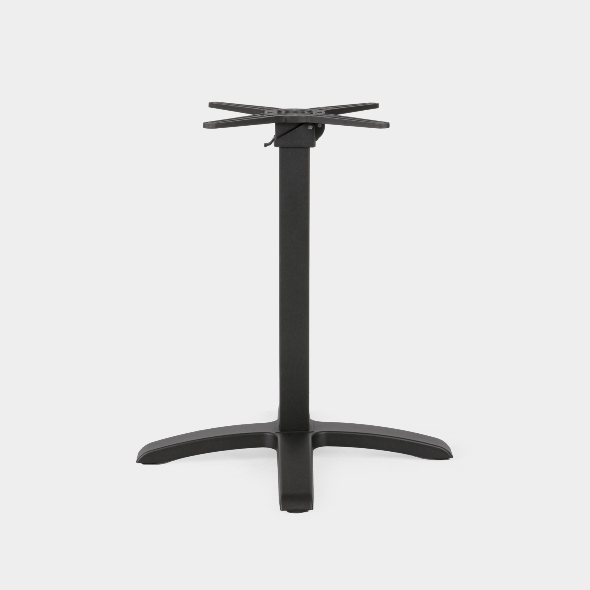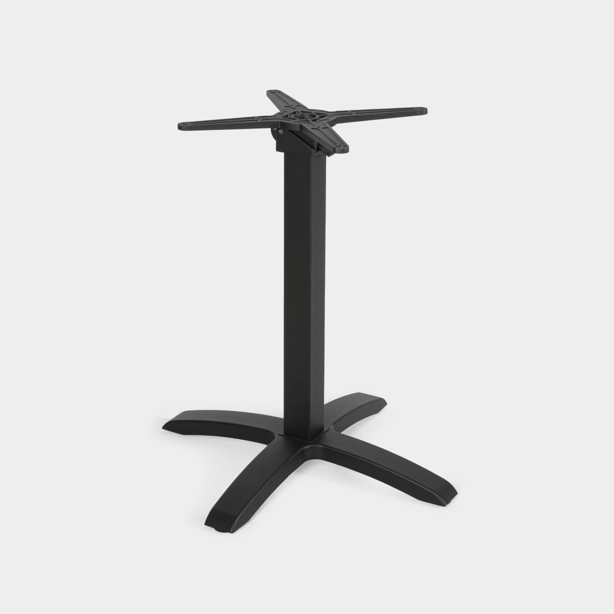 Dieses Tischgestell wurde speziell für den Einsatz in gastronomischen Einrichtungen sowie im Innen- und Außenbereich konzipiert. Die Konstruktion besteht aus einem Kreuz- und Säulenelement aus hochdruckgegossenem Aluminium sowie einem Sockel aus Gusseisen. Die Oberfläche ist mit einer elektrostatischen Pulverbeschichtung versehen und in der Farbe Schwarz erhältlich – für eine langlebige, korrosionsbeständige Nutzung.